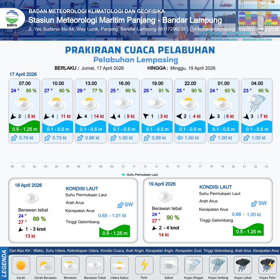 16 Apr 26, 23.00 3 jam kedepan | Cerah Berawan | Utara 3 kt Gust Peningkatan kecepatan angin yang singkat dan tiba-tiba : 4 kt | | | 10 km | 23 °C | 97 % | +0.63 m |