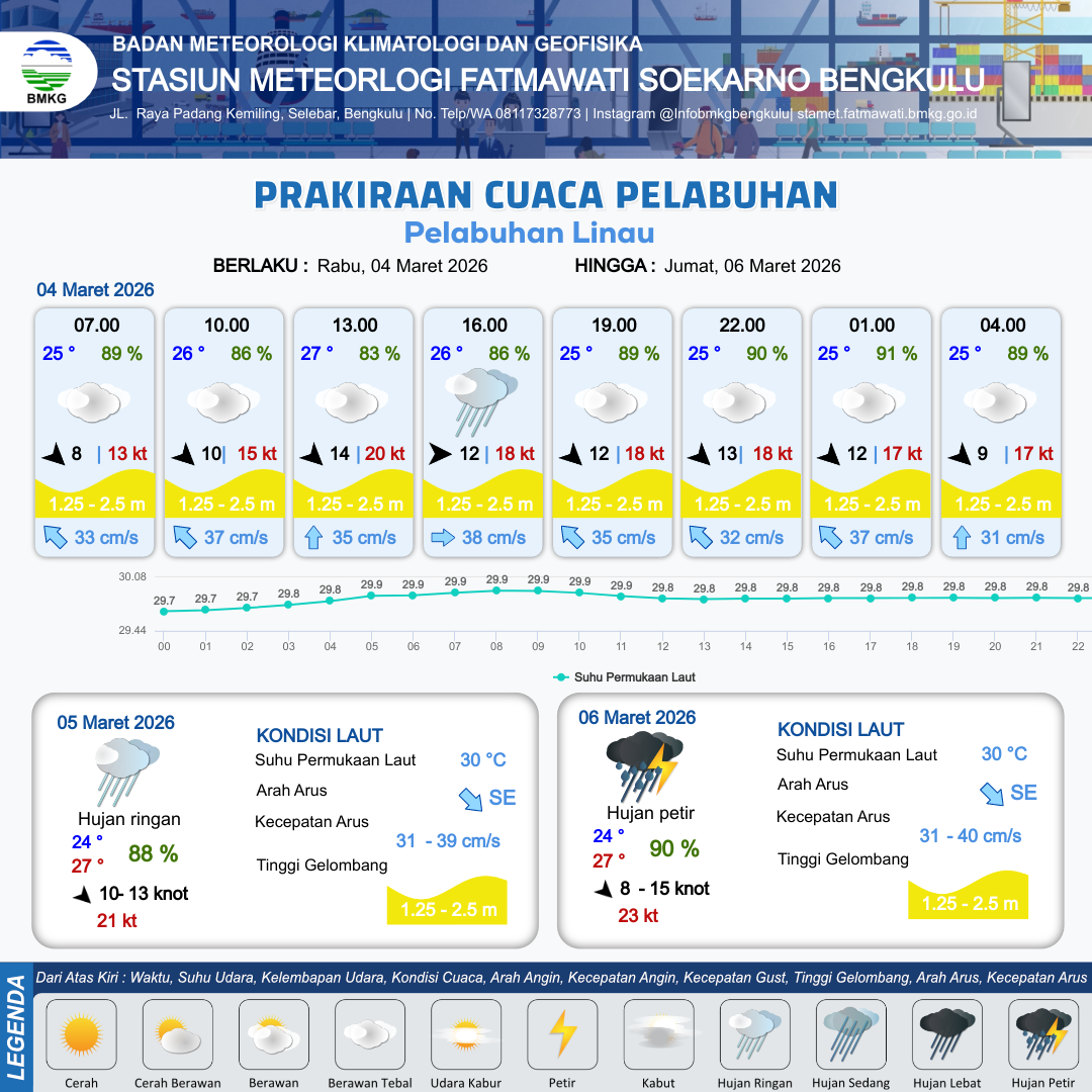 3 Mar 26, 06.00 14 jam yang lalu | Berawan Tebal | Barat 13 kt Gust Peningkatan kecepatan angin yang singkat dan tiba-tiba : 17 kt | | | 10 km | 30 °C | 79 % | -0.29 m |