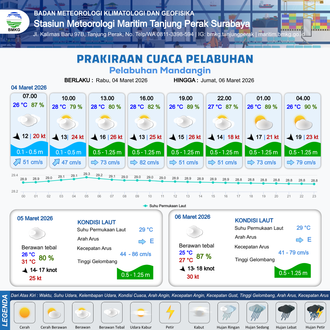 3 Mar 26, 03.00 17 jam yang lalu | Berawan Tebal | Barat 10 kt Gust Peningkatan kecepatan angin yang singkat dan tiba-tiba : 18 kt | | | 10 km | 27 °C | 82 % | +0.62 m |