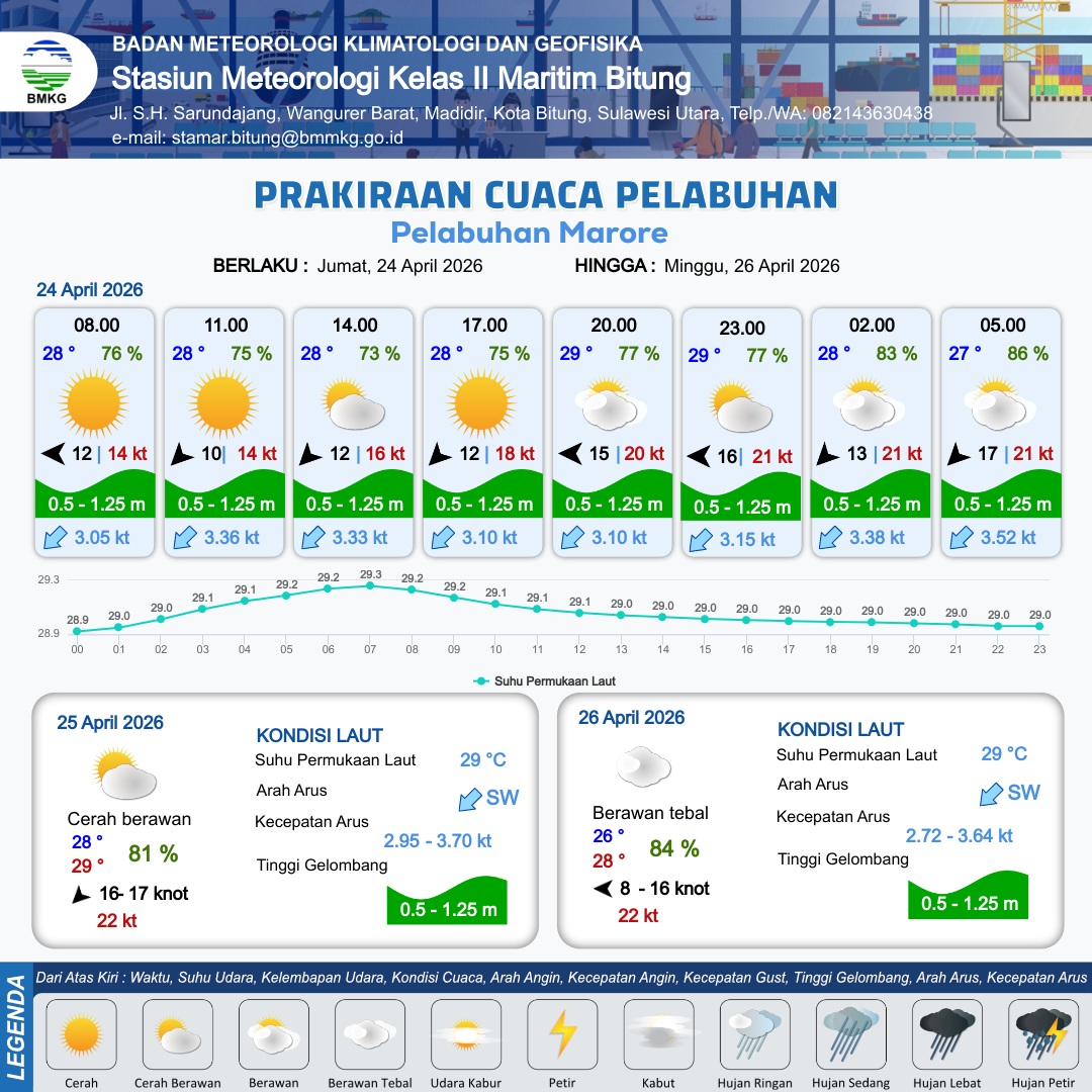 23 Apr 26, 22.00 1 hari 9 jam kedepan | Timur Laut 13 kt Gust Peningkatan kecepatan angin yang singkat dan tiba-tiba : 17 kt | 0.7 m Rendah | Barat Daya 3.1 Knot | 9 km | 28 °C | 75 % | -0.04 m | |