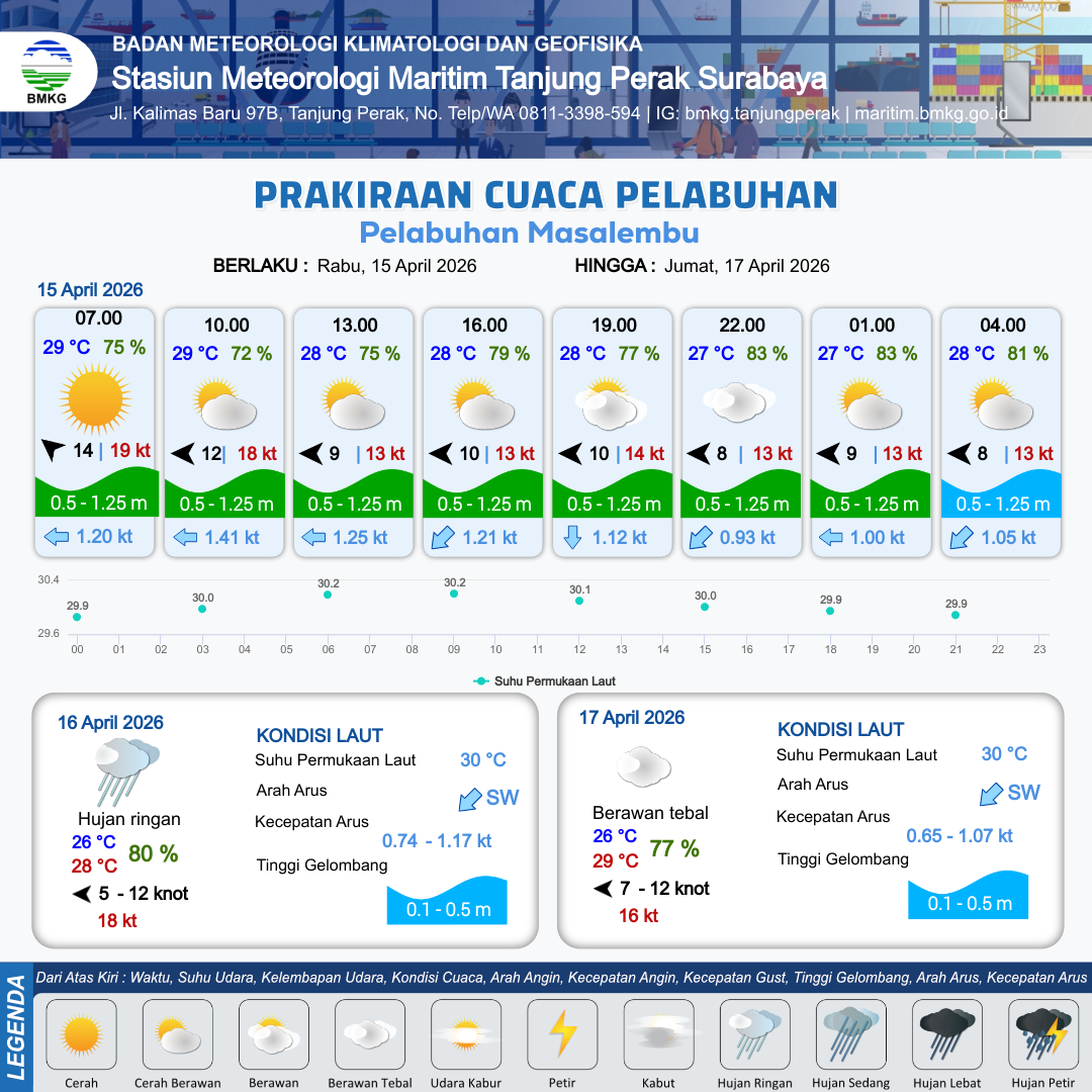 15 Apr 26, 21.00 2 jam kedepan | Cerah Berawan | Timur 8 kt Gust Peningkatan kecepatan angin yang singkat dan tiba-tiba : 13 kt | | | 10 km | 28 °C | 81 % | +0.56 m |