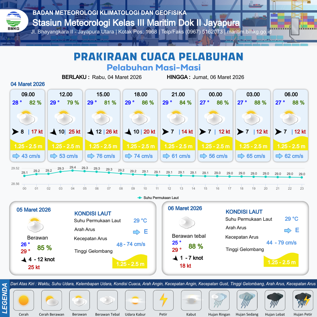 3 Mar 26, 23.00 3 jam kedepan | Berawan Tebal | Barat 7 kt Gust Peningkatan kecepatan angin yang singkat dan tiba-tiba : 16 kt | | | 10 km | 28 °C | 84 % | +0.54 m |