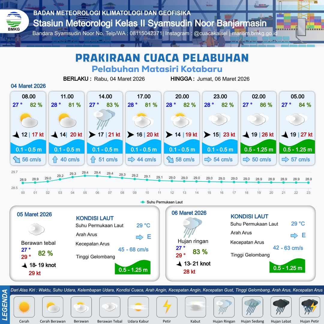 3 Mar 26, 06.00 14 jam yang lalu | Berawan Tebal | Barat 18 kt Gust Peningkatan kecepatan angin yang singkat dan tiba-tiba : 23 kt | | | 10 km | 28 °C | 81 % | +0.56 m |
