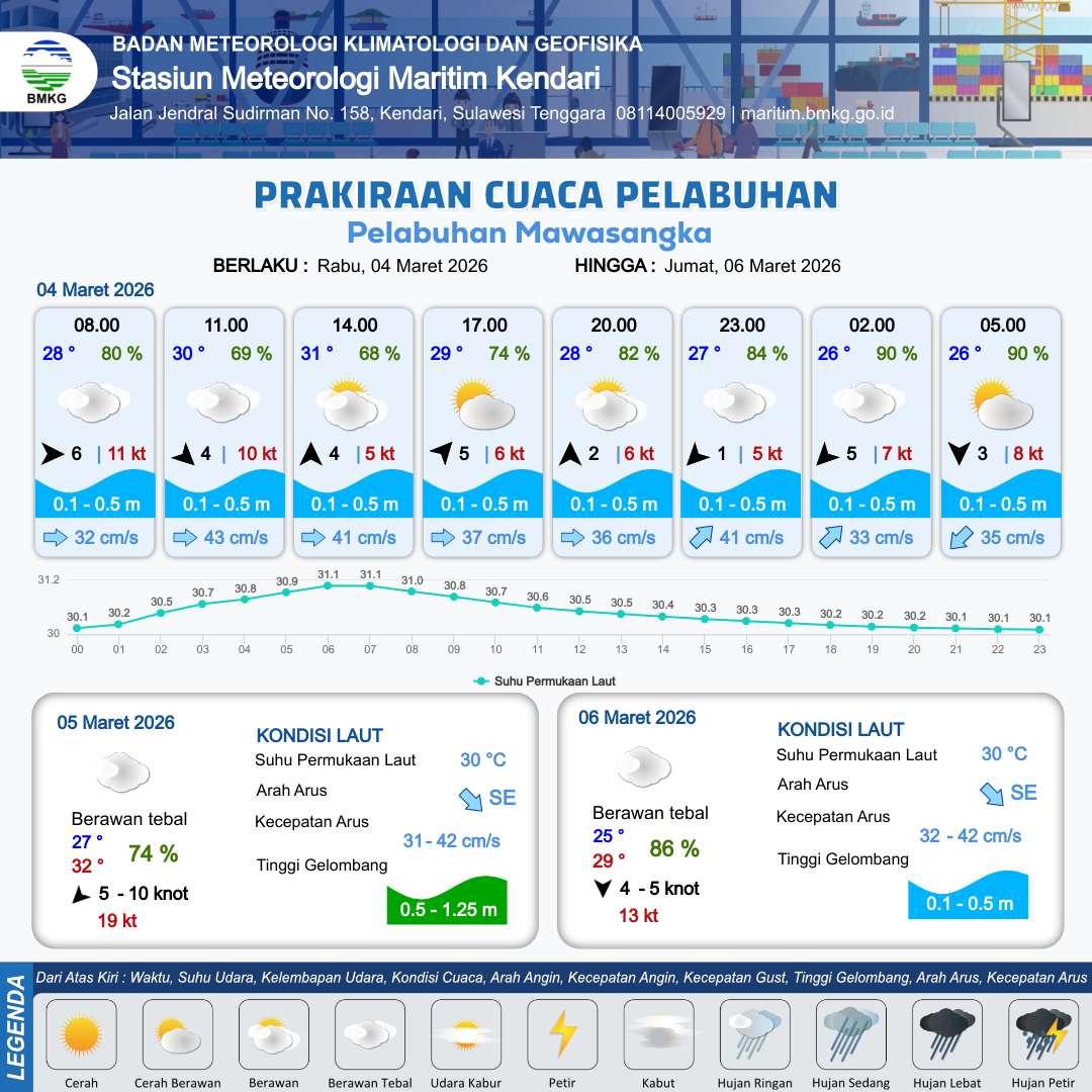 3 Mar 26, 05.00 15 jam yang lalu | Berawan | Barat Daya 5 kt Gust Peningkatan kecepatan angin yang singkat dan tiba-tiba : 8 kt | | | 10 km | 31 °C | 65 % | +0.89 m |