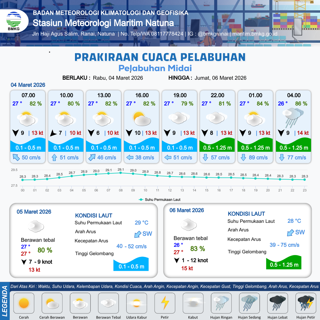 3 Mar 26, 23.00 3 jam kedepan | Cerah Berawan | Utara 9 kt Gust Peningkatan kecepatan angin yang singkat dan tiba-tiba : 15 kt | | | 9 km | 27 °C | 85 % | +0.18 m |