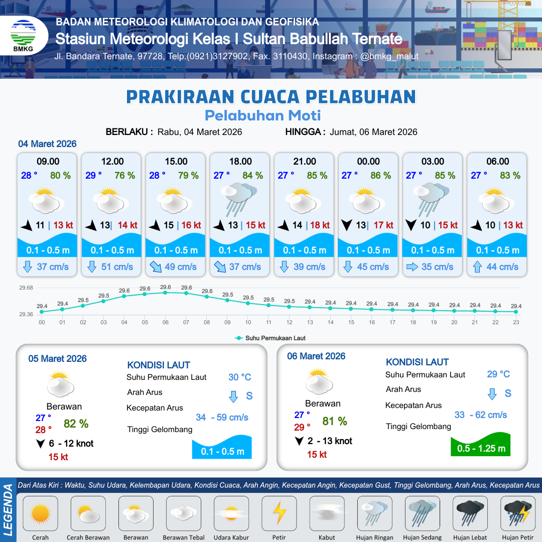3 Mar 26, 22.00 2 jam kedepan | Berawan | Utara 11 kt Gust Peningkatan kecepatan angin yang singkat dan tiba-tiba : 16 kt | | | 10 km | 28 °C | 84 % | +0.30 m |