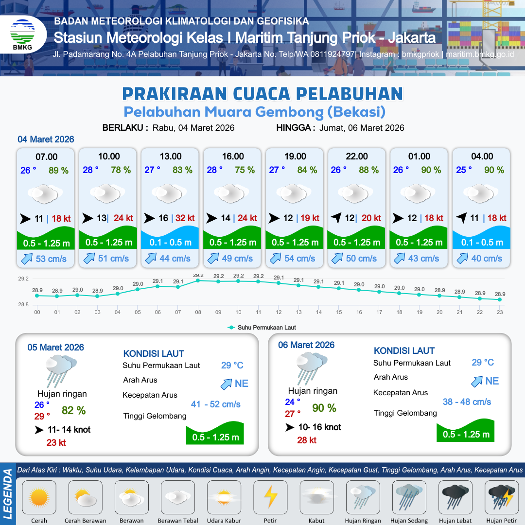 3 Mar 26, 06.00 14 jam yang lalu | Berawan Tebal | Barat 16 kt Gust Peningkatan kecepatan angin yang singkat dan tiba-tiba : 25 kt | | | 8 km | 29 °C | 76 % | +0.29 m |