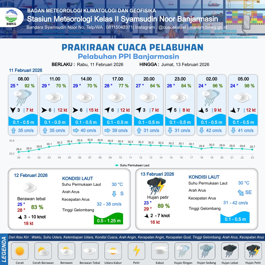 11 Feb 26, 18.00 2 jam kedepan | Utara 3 kt Gust Peningkatan kecepatan angin yang singkat dan tiba-tiba : 5 kt | 0.2 m Tenang | Timur 52.0 cm/s | 6 km | 24 °C | 96 % | -0.56 m | |