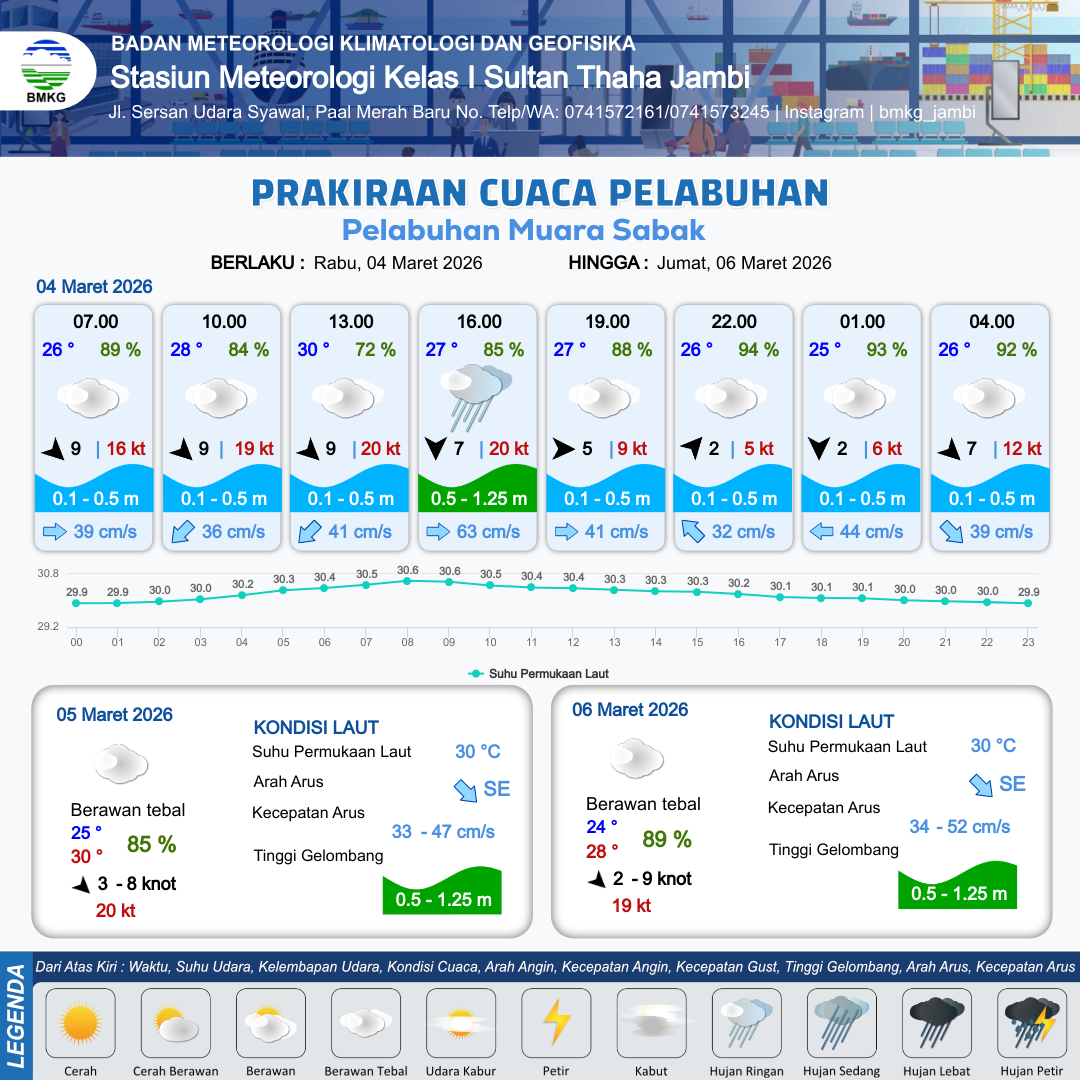 3 Mar 26, 23.00 3 jam kedepan | Berawan Tebal | Barat Laut 7 kt Gust Peningkatan kecepatan angin yang singkat dan tiba-tiba : 14 kt | | | 10 km | 26 °C | 89 % | +0.84 m |