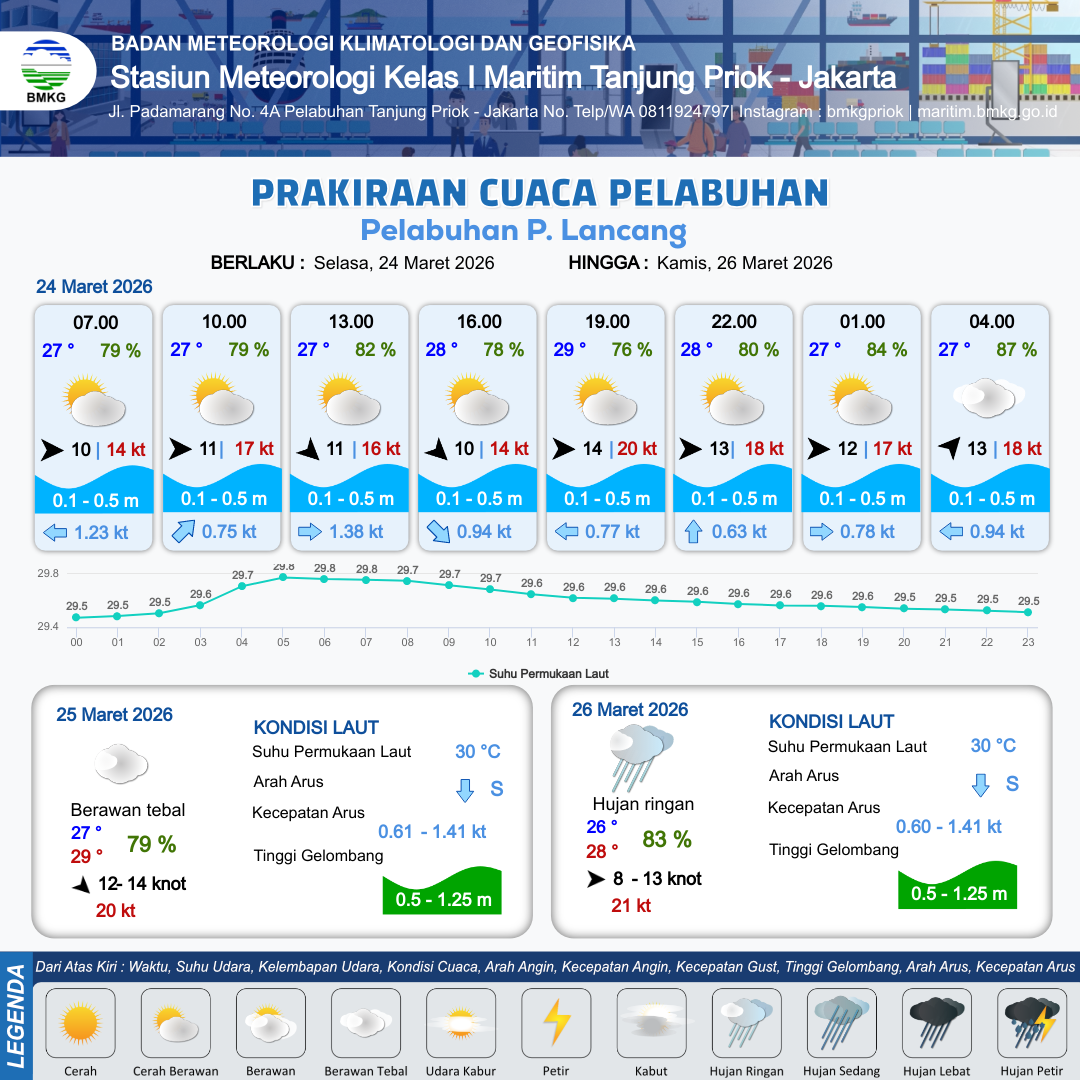 24 Mar 26, 21.00 21 jam kedepan | Barat Daya 13 kt Gust Peningkatan kecepatan angin yang singkat dan tiba-tiba : 18 kt | 0.2 m Tenang | Barat 0.9 Knot | 10 km | 27 °C | 87 % | +0.24 m | |
