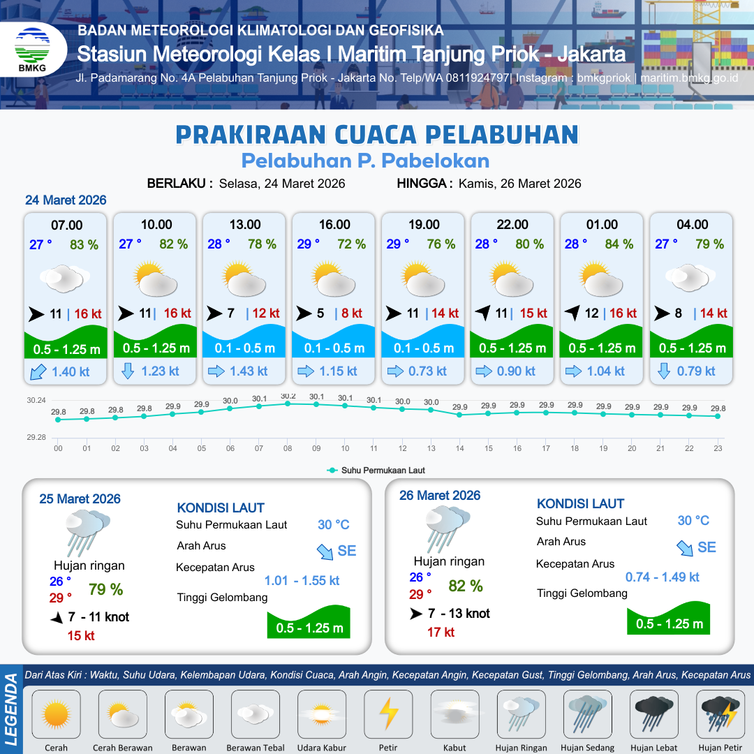 24 Mar 26, 02.00 2 jam kedepan | Barat 11 kt Gust Peningkatan kecepatan angin yang singkat dan tiba-tiba : 16 kt | 0.7 m Rendah | Selatan 1.3 Knot | 10 km | 27 °C | 83 % | +0.01 m | |