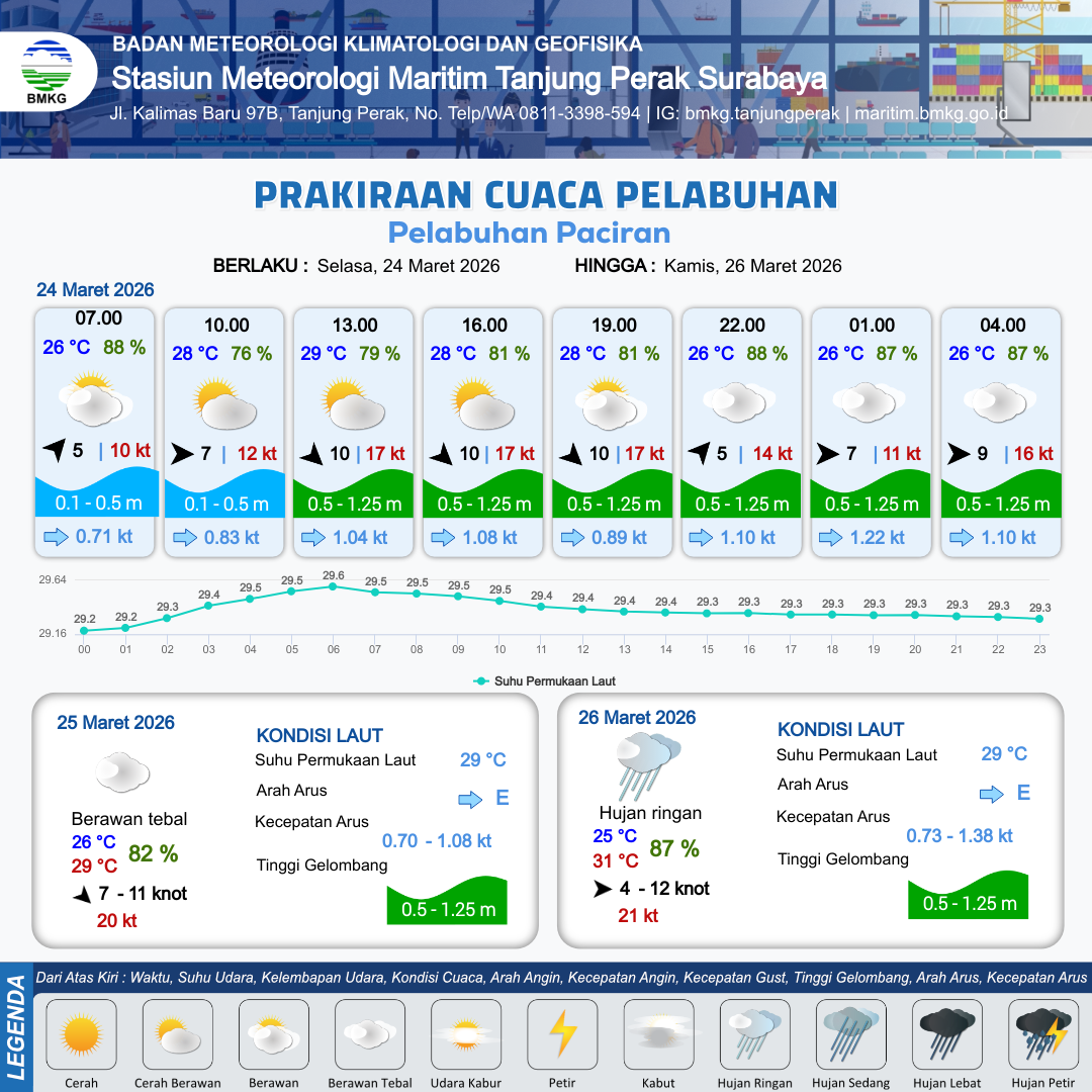 24 Mar 26, 23.00 23 jam kedepan | Barat Daya 7 kt Gust Peningkatan kecepatan angin yang singkat dan tiba-tiba : 13 kt | 0.7 m Rendah | Timur 0.9 Knot | 10 km | 26 °C | 89 % | -0.29 m |