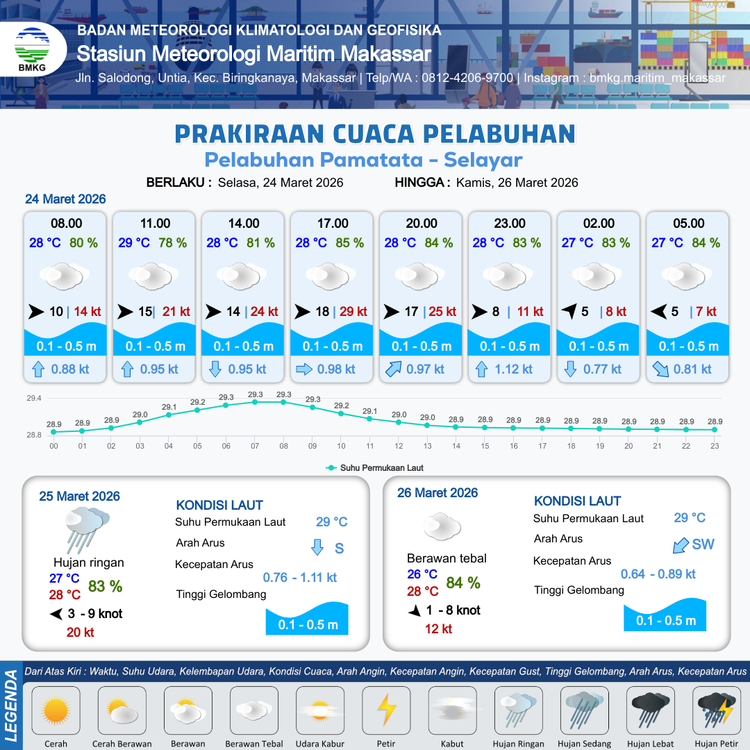 24 Mar 26, 03.00 3 jam kedepan | Barat 15 kt Gust Peningkatan kecepatan angin yang singkat dan tiba-tiba : 21 kt | 0.2 m Tenang | Utara 0.9 Knot | 10 km | 29 °C | 78 % | -0.40 m | |