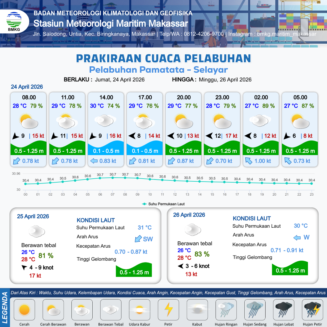 24 Apr 26, 10.00 2 jam kedepan | Timur 8 kt Gust Peningkatan kecepatan angin yang singkat dan tiba-tiba : 13 kt | 0.5 m Rendah | Barat Daya 0.9 Knot | 10 km | 29 °C | 78 % | +0.70 m | |
