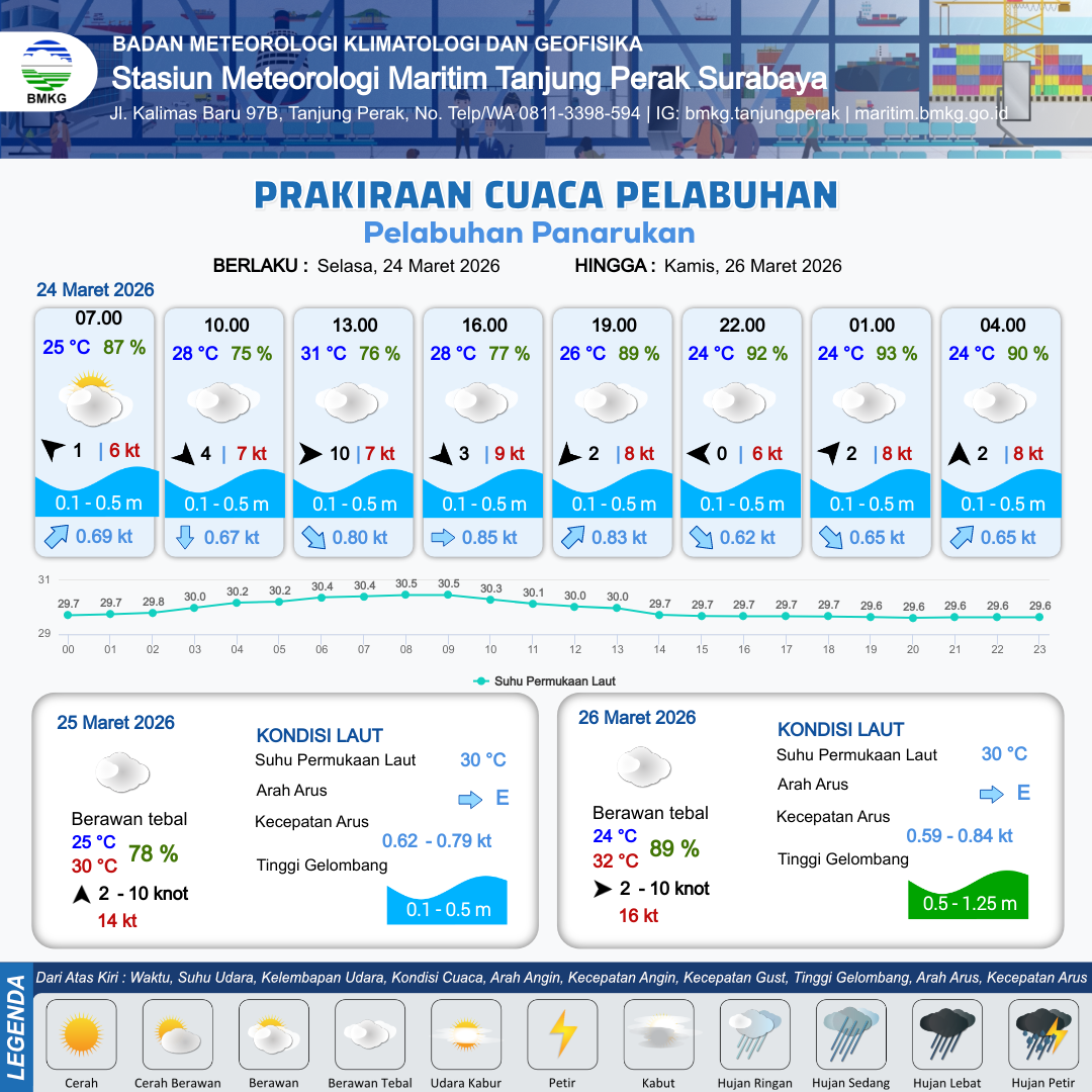 24 Mar 26, 23.00 23 jam kedepan | Selatan 3 kt Gust Peningkatan kecepatan angin yang singkat dan tiba-tiba : 7 kt | 0.5 m Rendah | Timur Laut 0.8 Knot | 10 km | 24 °C | 85 % | +0.23 m |