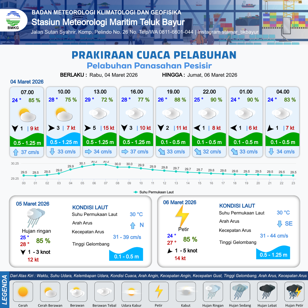 3 Mar 26, 05.00 15 jam yang lalu | Cerah Berawan | Barat 6 kt Gust Peningkatan kecepatan angin yang singkat dan tiba-tiba : 10 kt | | | 10 km | 29 °C | 72 % | -0.45 m |