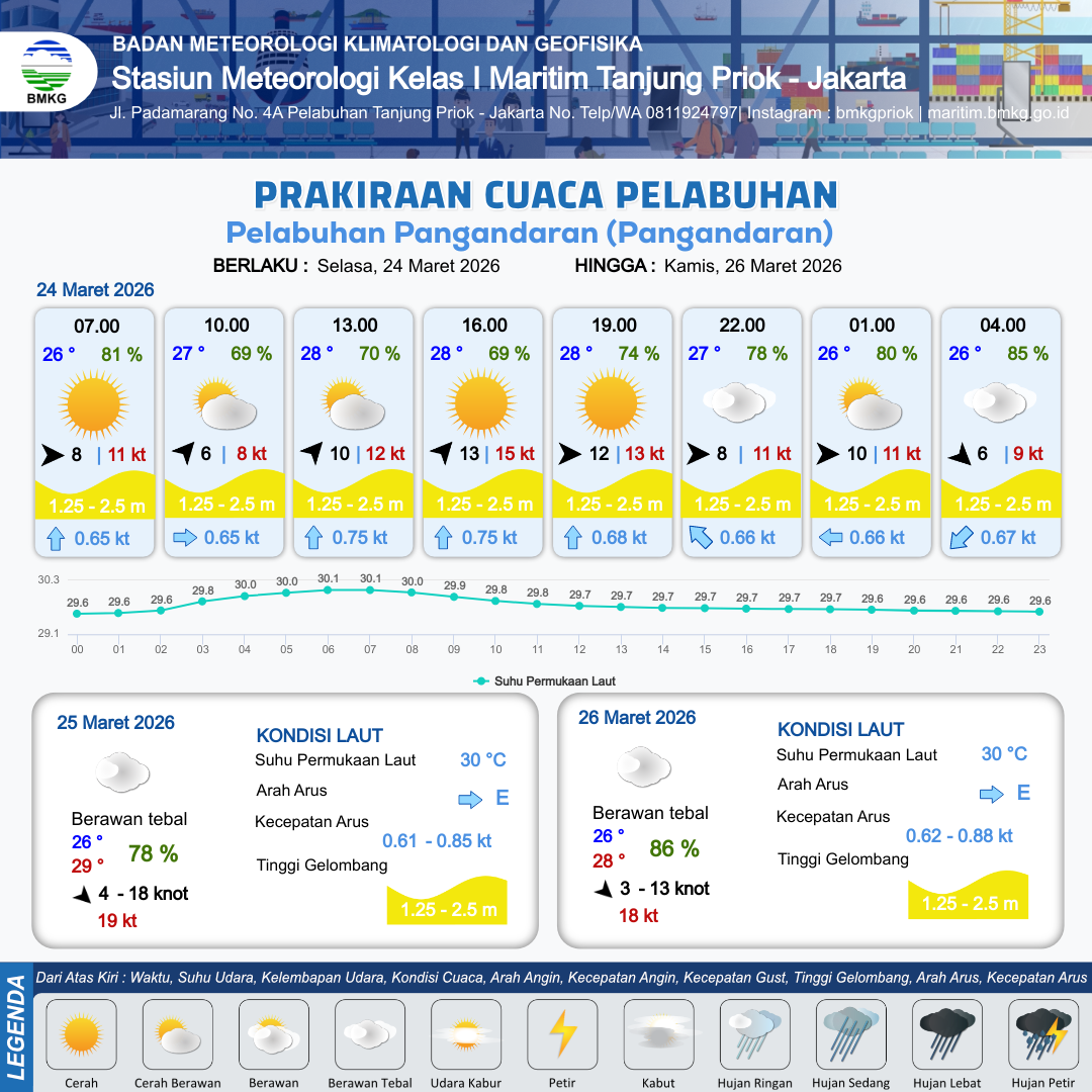 24 Mar 26, 12.00 12 jam kedepan | Barat 12 kt Gust Peningkatan kecepatan angin yang singkat dan tiba-tiba : 13 kt | 1.5 m Sedang | Utara 0.7 Knot | 8 km | 28 °C | 74 % | -0.71 m | |