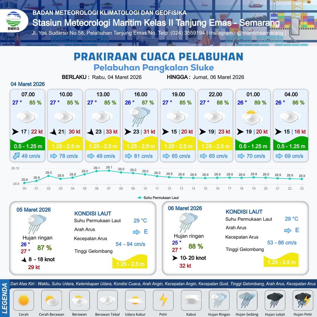 3 Mar 26, 10.00 10 jam yang lalu | Berawan Tebal | Barat 19 kt Gust Peningkatan kecepatan angin yang singkat dan tiba-tiba : 27 kt | | | 8 km | 27 °C | 85 % | +0.58 m |