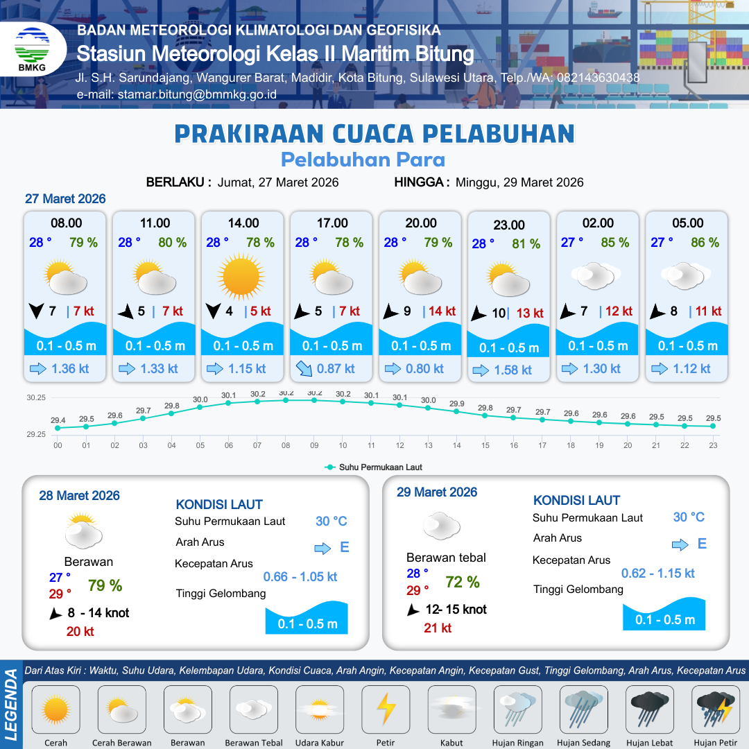 27 Mar 26, 13.00 4 jam kedepan | Timur Laut 9 kt Gust Peningkatan kecepatan angin yang singkat dan tiba-tiba : 14 kt | 0.4 m Tenang | Timur 1.0 Knot | 10 km | 28 °C | 78 % | -0.42 m | |