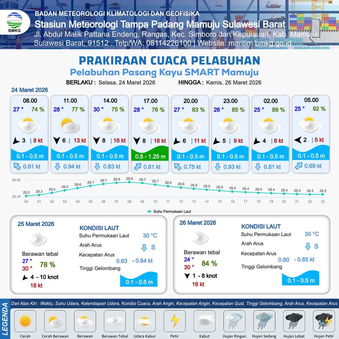 24 Mar 26, 06.00 6 jam kedepan | Utara 8 kt Gust Peningkatan kecepatan angin yang singkat dan tiba-tiba : 16 kt | 0.5 m Rendah | Selatan 0.8 Knot | 9 km | 30 °C | 75 % | -0.28 m | |