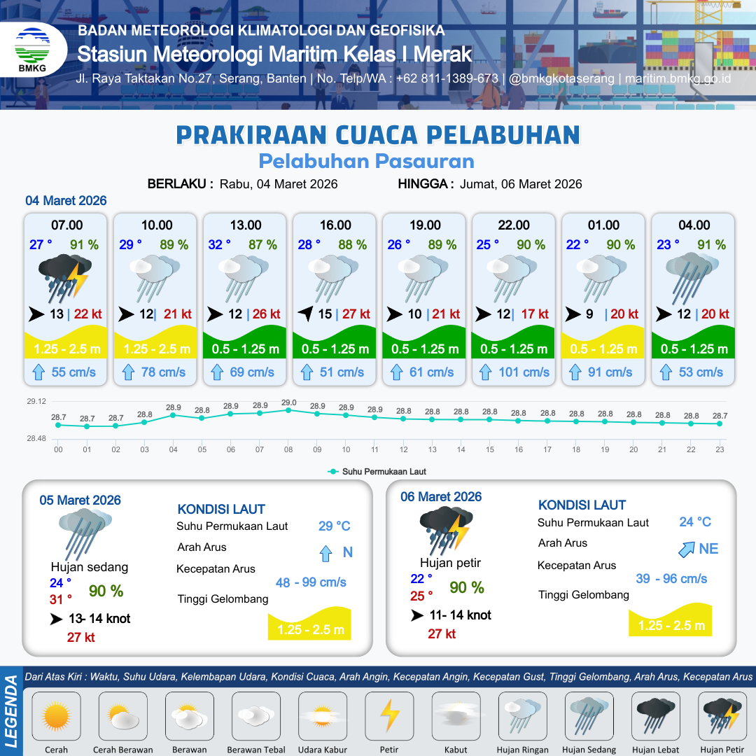 3 Mar 26, 23.00 3 jam kedepan | Hujan Ringan | Barat 14 kt Gust Peningkatan kecepatan angin yang singkat dan tiba-tiba : 21 kt | | | 10 km | 25 °C | 90 % | +0.30 m |