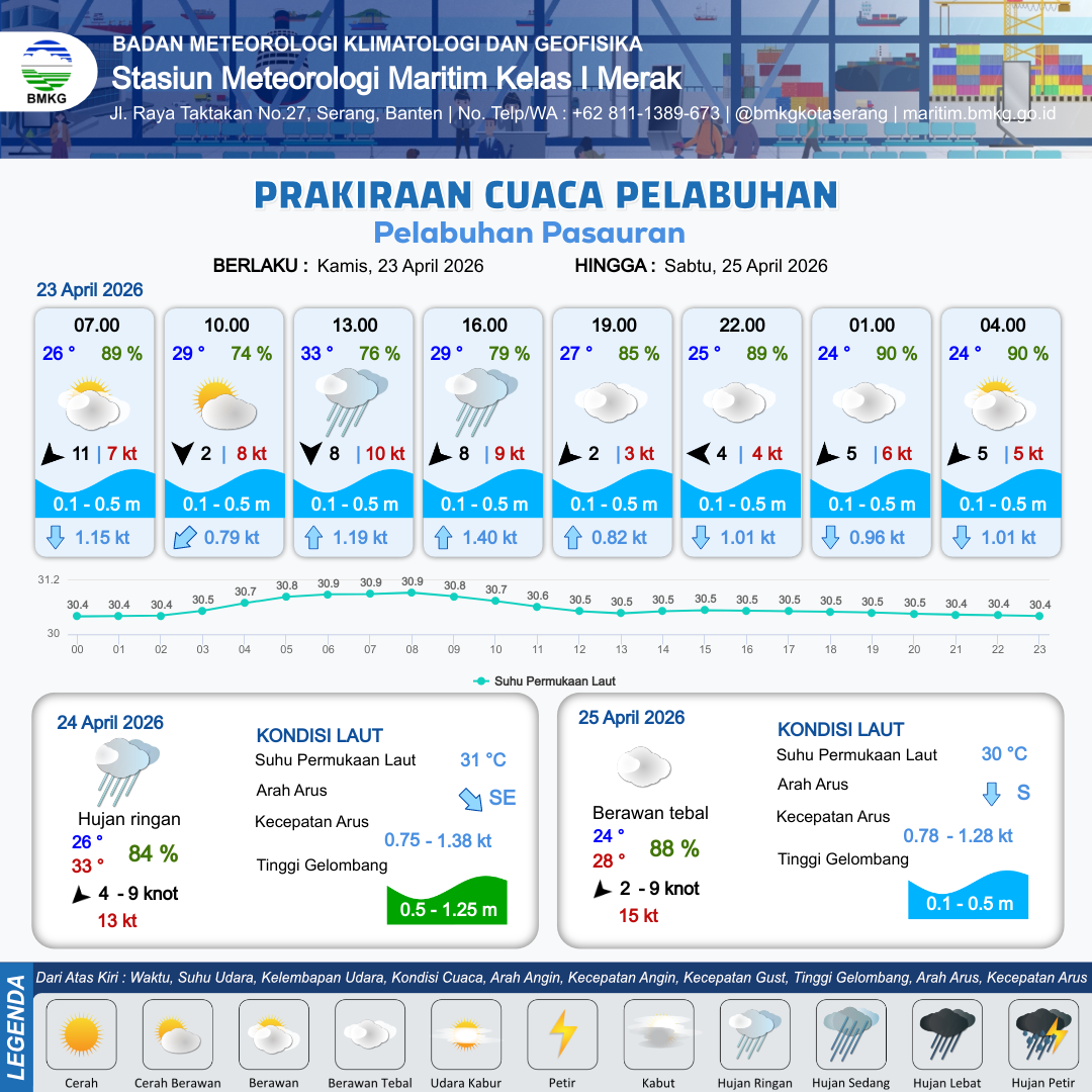 23 Apr 26, 08.00 22 jam kedepan | Timur Laut 8 kt Gust Peningkatan kecepatan angin yang singkat dan tiba-tiba : 13 kt | 0.3 m Tenang | Utara 1.4 Knot | 10 km | 30 °C | 80 % | -0.23 m | |