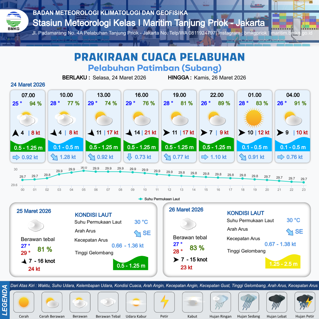 24 Mar 26, 08.00 8 jam kedepan | Barat Laut 14 kt Gust Peningkatan kecepatan angin yang singkat dan tiba-tiba : 20 kt | 1 m Rendah | Selatan 0.7 Knot | 8 km | 29 °C | 77 % | +0.33 m | |