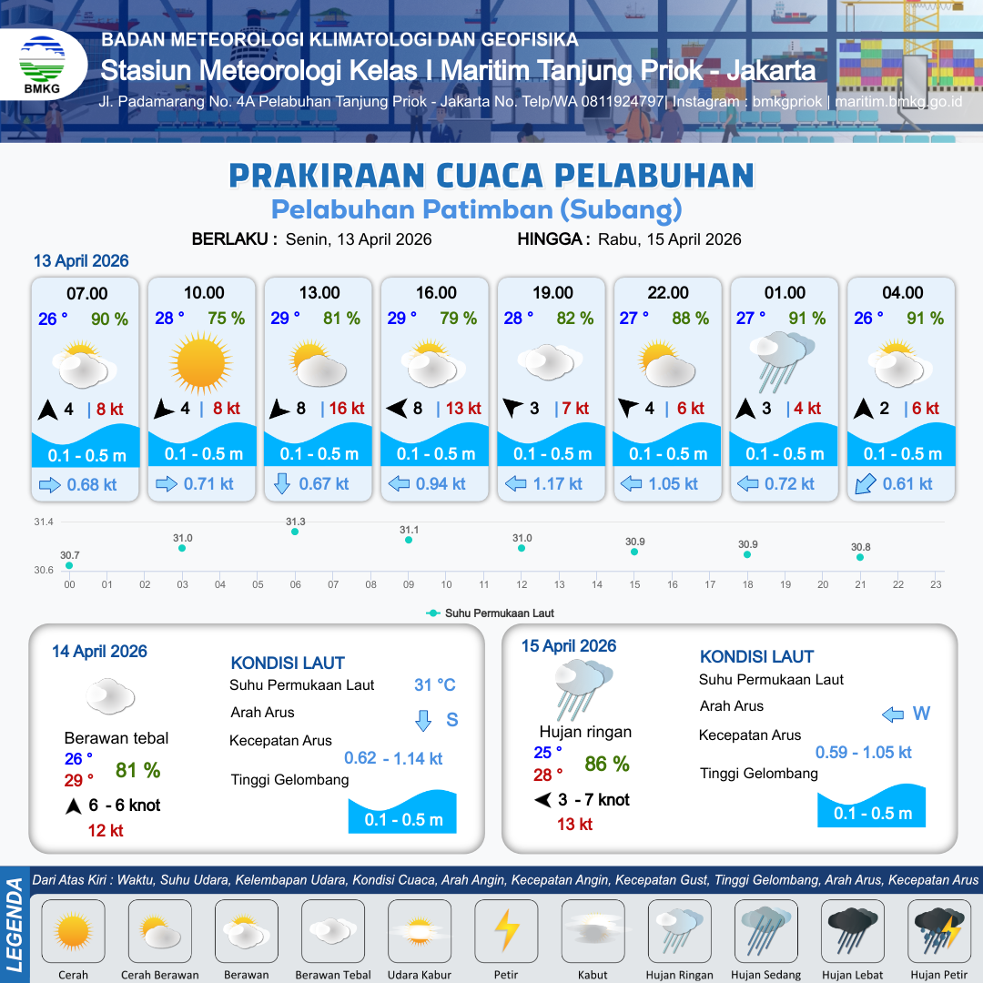 13 Apr 26, 16.00 4 jam kedepan | Tenggara 4 kt Gust Peningkatan kecepatan angin yang singkat dan tiba-tiba : 6 kt | 0.3 m Tenang | Barat 1.1 Knot | 8 km | 27 °C | 91 % | +0.61 m | |