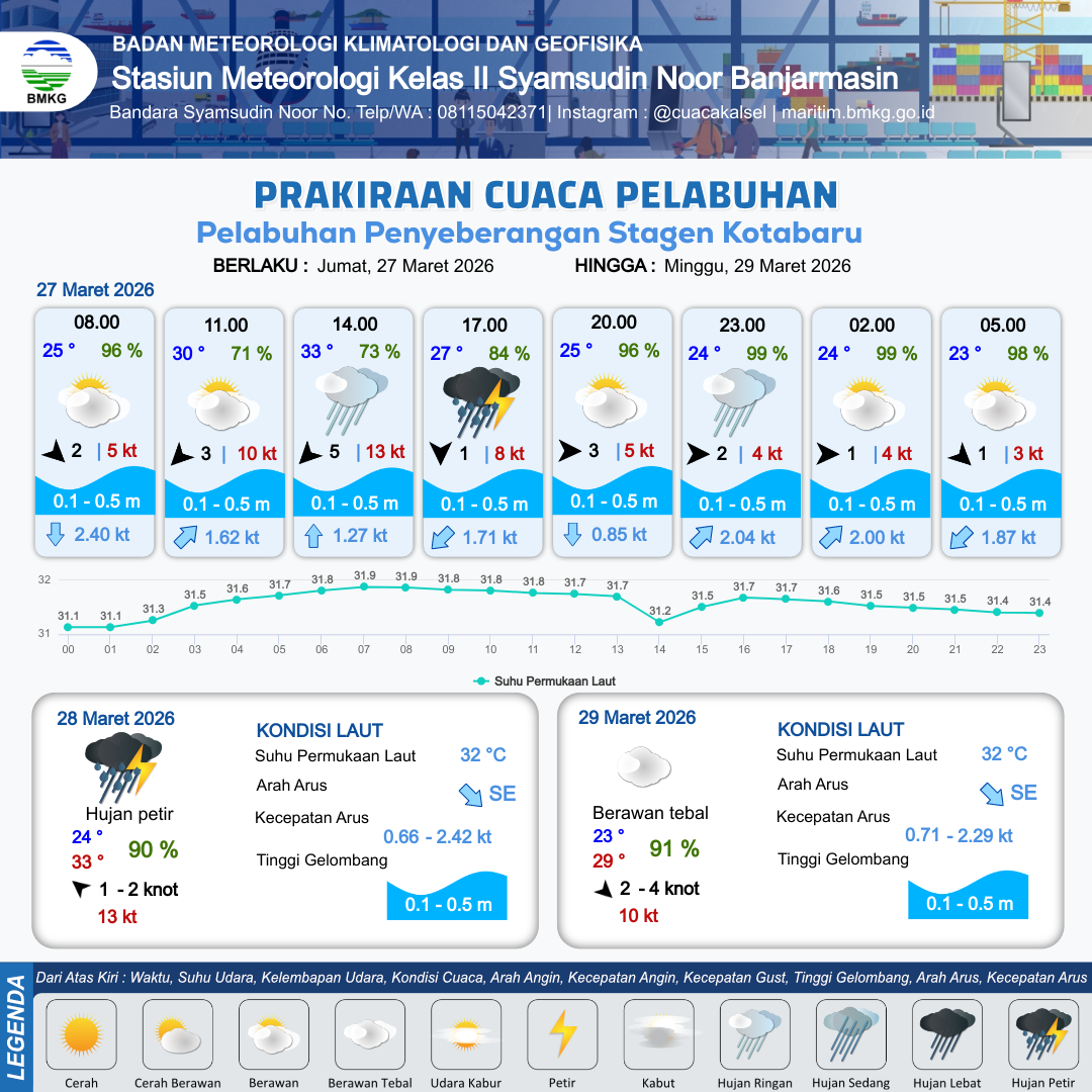 27 Mar 26, 11.00 2 jam kedepan | Barat 3 kt Gust Peningkatan kecepatan angin yang singkat dan tiba-tiba : 5 kt | 0.1 m Tenang | Barat Daya 1.4 Knot | 10 km | 25 °C | 96 % | +0.80 m | |
