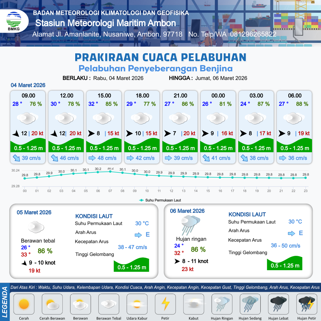3 Mar 26, 22.00 2 jam kedepan | Berawan Tebal | Barat Laut 13 kt Gust Peningkatan kecepatan angin yang singkat dan tiba-tiba : 22 kt | | | 10 km | 28 °C | 84 % | -0.63 m |