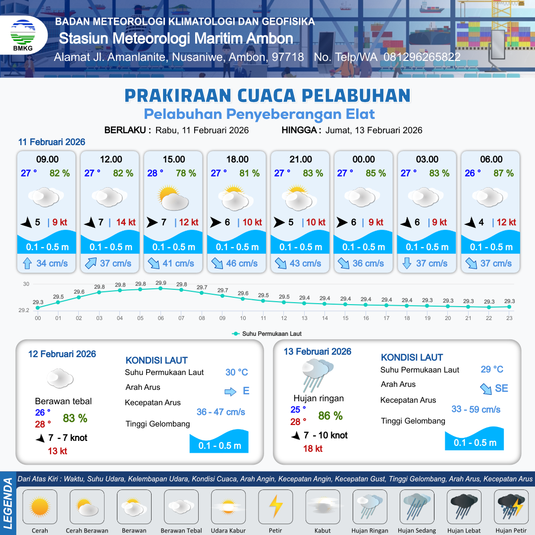 11 Feb 26, 18.00 2 jam kedepan | Barat Laut 6 kt Gust Peningkatan kecepatan angin yang singkat dan tiba-tiba : 9 kt | 0.4 m Tenang | Selatan 37.0 cm/s | 10 km | 27 °C | 83 % | -0.53 m | |