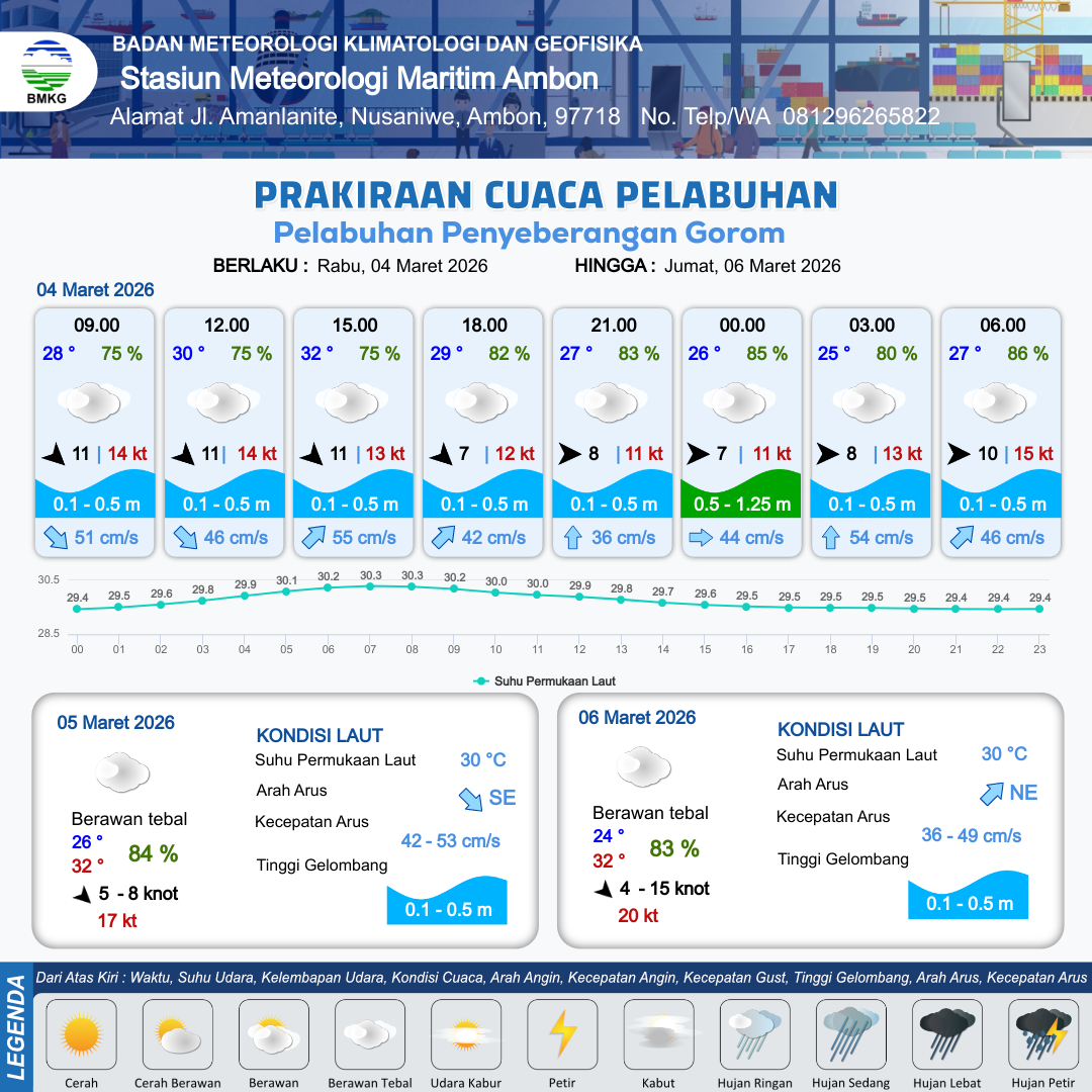 3 Mar 26, 23.00 3 jam kedepan | Berawan Tebal | Barat Laut 11 kt Gust Peningkatan kecepatan angin yang singkat dan tiba-tiba : 16 kt | | | 10 km | 29 °C | 74 % | -0.97 m |