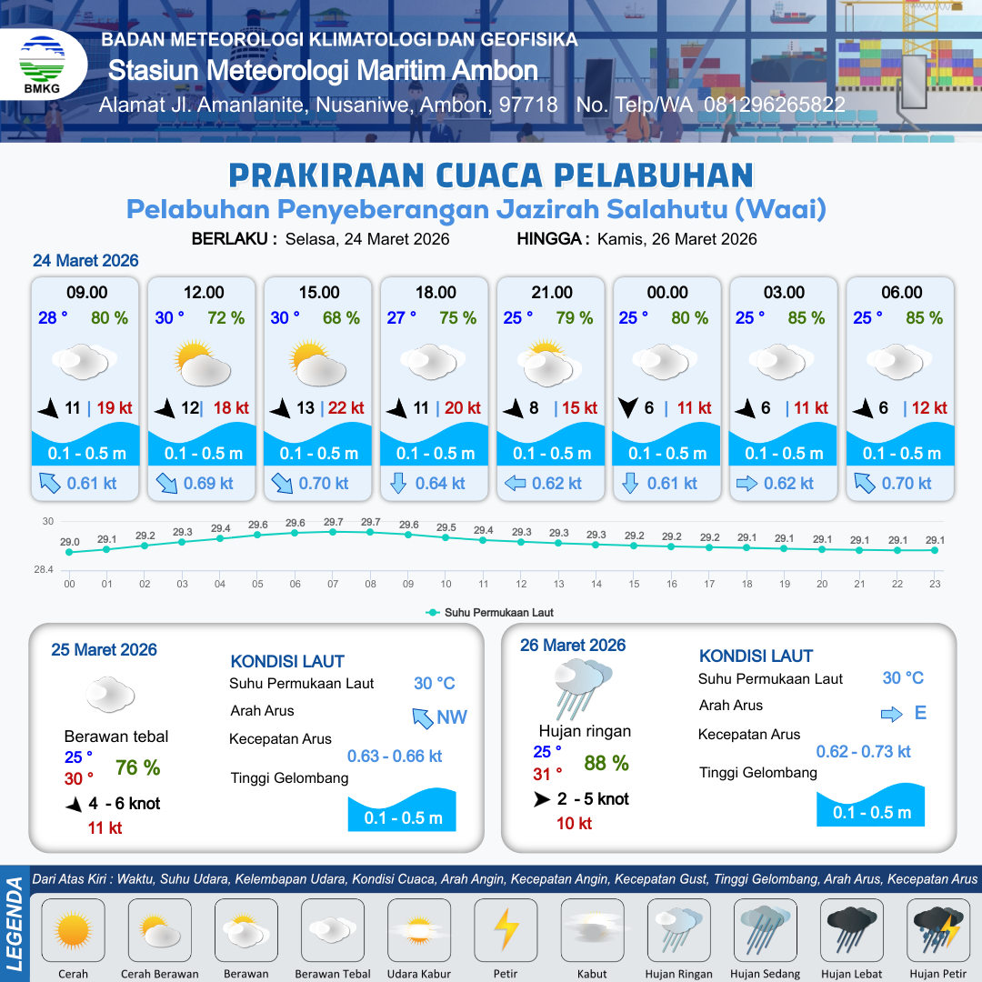 24 Mar 26, 12.00 12 jam kedepan | Barat Laut 6 kt Gust Peningkatan kecepatan angin yang singkat dan tiba-tiba : 9 kt | 0.2 m Tenang | Barat 0.6 Knot | 10 km | 25 °C | 76 % | -0.11 m | |