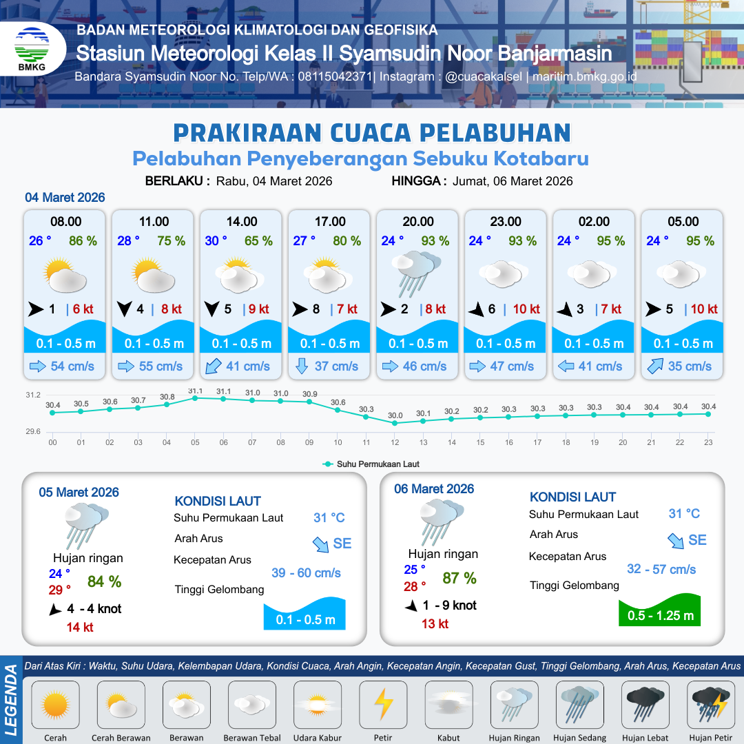 3 Mar 26, 14.00 6 jam yang lalu | Berawan Tebal | Barat 2 kt Gust Peningkatan kecepatan angin yang singkat dan tiba-tiba : 13 kt | | | 10 km | 25 °C | 90 % | +0.03 m |
