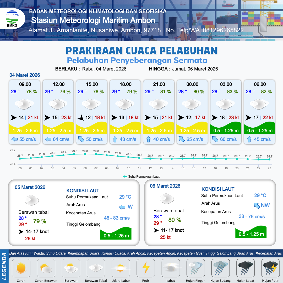 3 Mar 26, 23.00 3 jam kedepan | Berawan Tebal | Barat Laut 16 kt Gust Peningkatan kecepatan angin yang singkat dan tiba-tiba : 21 kt | | | 10 km | 29 °C | 80 % | -1.10 m |