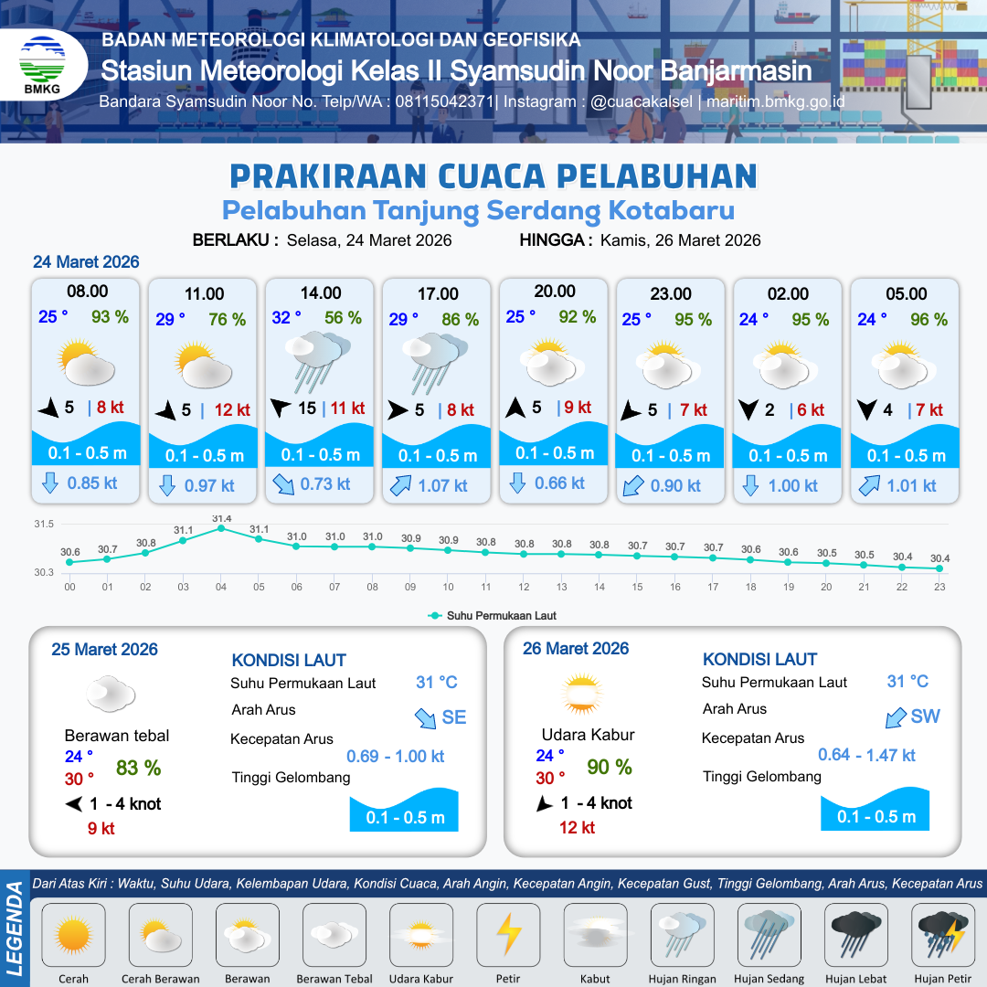 24 Mar 26, 06.00 6 jam kedepan | Timur 15 kt Gust Peningkatan kecepatan angin yang singkat dan tiba-tiba : 12 kt | 0.1 m Tenang | Selatan 1.1 Knot | 9 km | 32 °C | 56 % | -0.42 m | |
