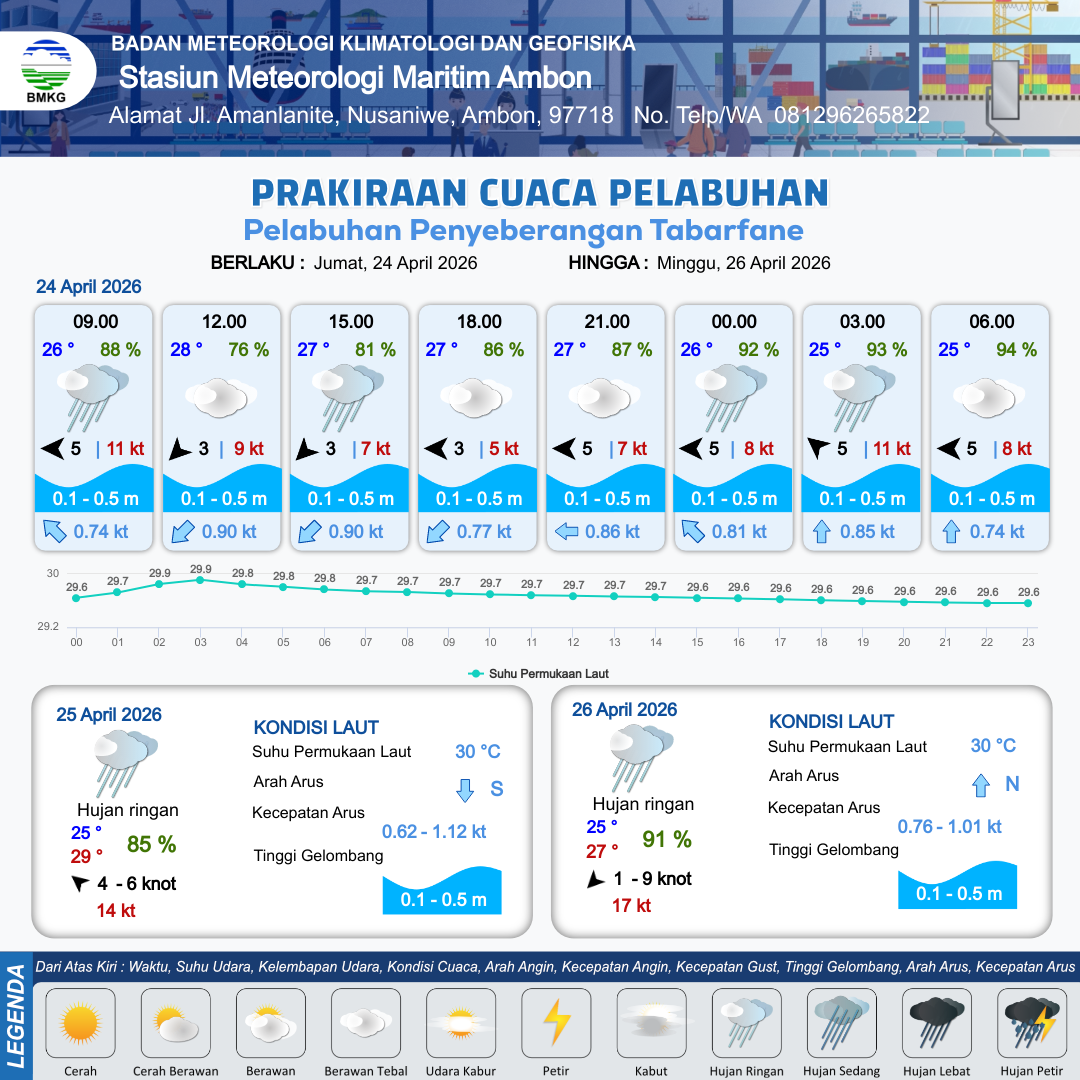24 Apr 26, 20.00 12 jam kedepan | Timur 5 kt Gust Peningkatan kecepatan angin yang singkat dan tiba-tiba : 9 kt | 0.2 m Tenang | Utara 0.8 Knot | 10 km | 25 °C | 94 % | -0.50 m | |