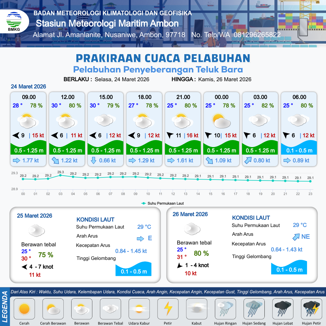 24 Mar 26, 04.00 4 jam kedepan | Timur 6 kt Gust Peningkatan kecepatan angin yang singkat dan tiba-tiba : 11 kt | 0.8 m Rendah | Selatan 0.8 Knot | 10 km | 30 °C | 81 % | -0.21 m | |