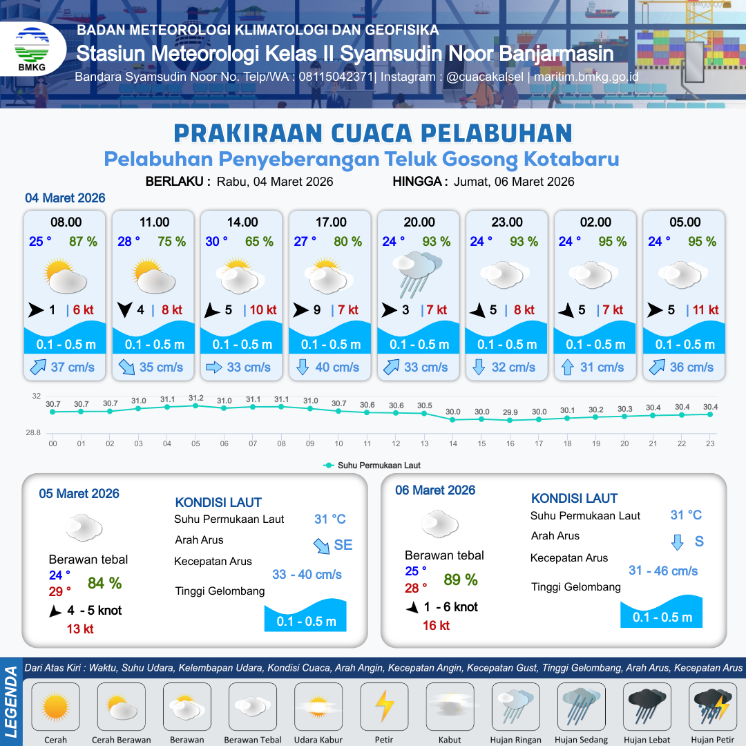 3 Mar 26, 06.00 14 jam yang lalu | Berawan Tebal | Timur Laut 5 kt Gust Peningkatan kecepatan angin yang singkat dan tiba-tiba : 10 kt | | | 10 km | 28 °C | 80 % | +0.30 m |