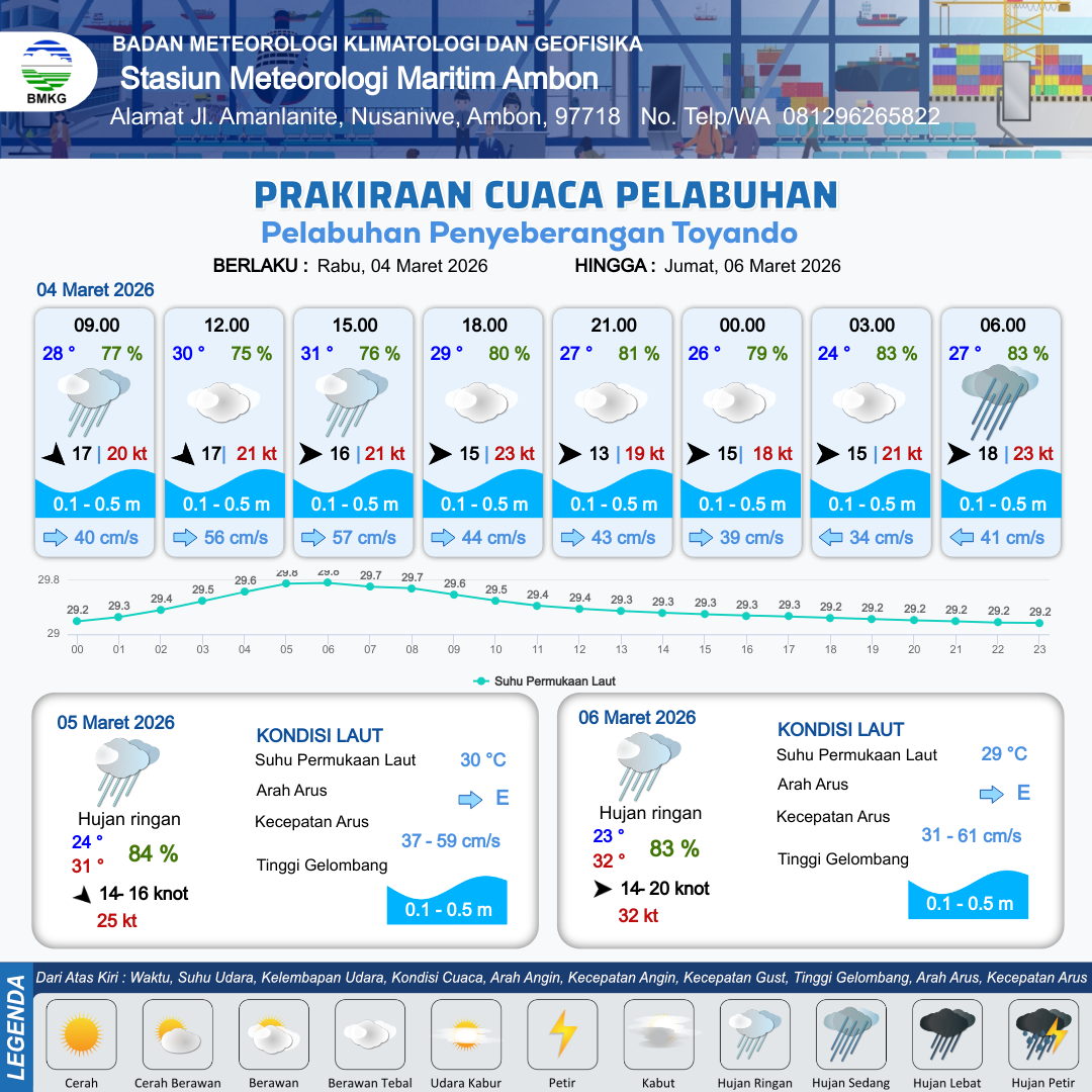 3 Mar 26, 23.00 3 jam kedepan | Berawan Tebal | Barat 22 kt Gust Peningkatan kecepatan angin yang singkat dan tiba-tiba : 19 kt | | | 10 km | 30 °C | 81 % | -0.98 m |