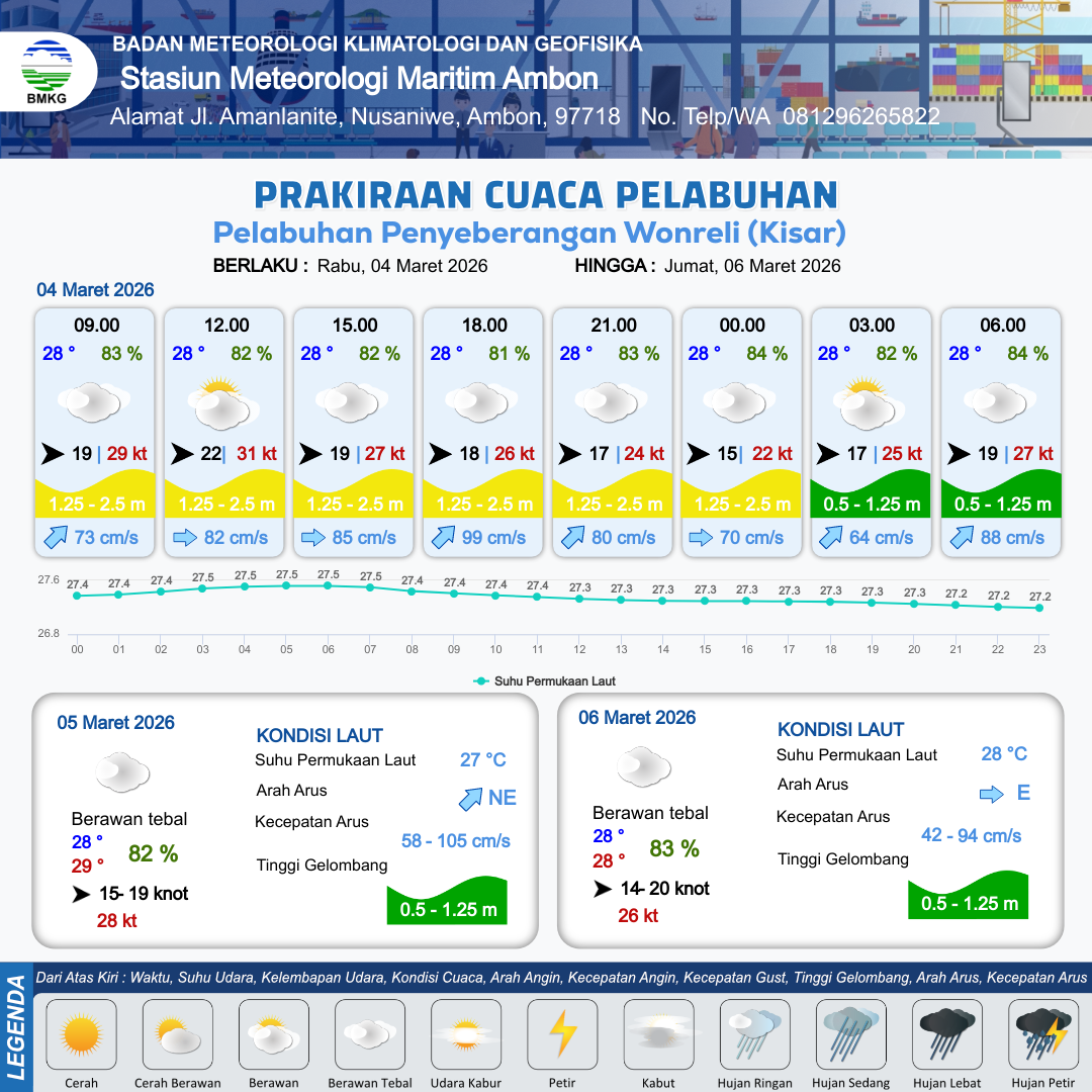 3 Mar 26, 04.00 16 jam yang lalu | Berawan Tebal | Barat 23 kt Gust Peningkatan kecepatan angin yang singkat dan tiba-tiba : 31 kt | | | 10 km | 30 °C | 83 % | +0.56 m |