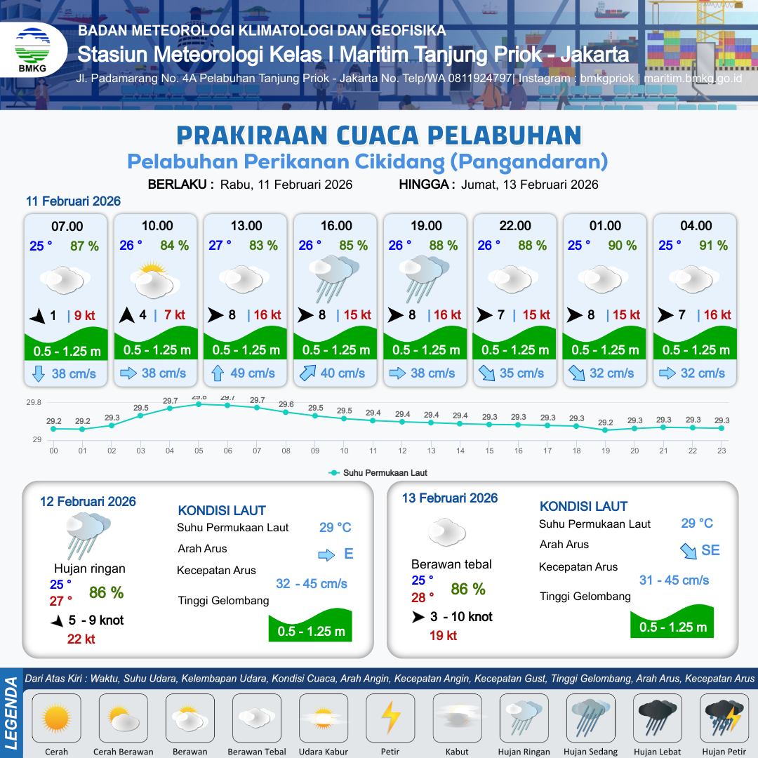11 Feb 26, 22.00 6 jam kedepan | Barat 7 kt Gust Peningkatan kecepatan angin yang singkat dan tiba-tiba : 14 kt | 0.9 m Rendah | Selatan 34.0 cm/s | 10 km | 25 °C | 91 % | -0.30 m | |