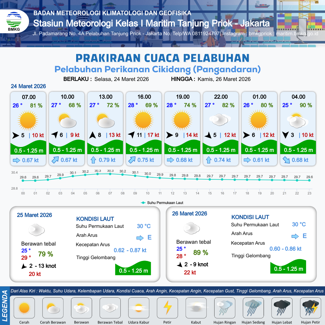 24 Mar 26, 08.00 10 jam kedepan | Barat Daya 11 kt Gust Peningkatan kecepatan angin yang singkat dan tiba-tiba : 16 kt | 0.9 m Rendah | Utara 0.9 Knot | 8 km | 28 °C | 70 % | -0.29 m | |