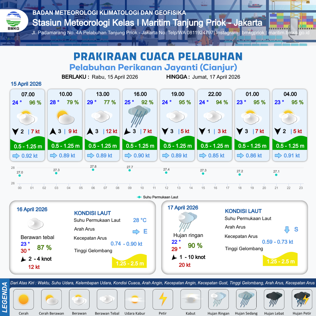 15 Apr 26, 12.00 4 jam kedepan | Utara 3 kt Gust Peningkatan kecepatan angin yang singkat dan tiba-tiba : 5 kt | 1.2 m Rendah | Timur 0.9 Knot | 10 km | 24 °C | 95 % | +0.61 m | |