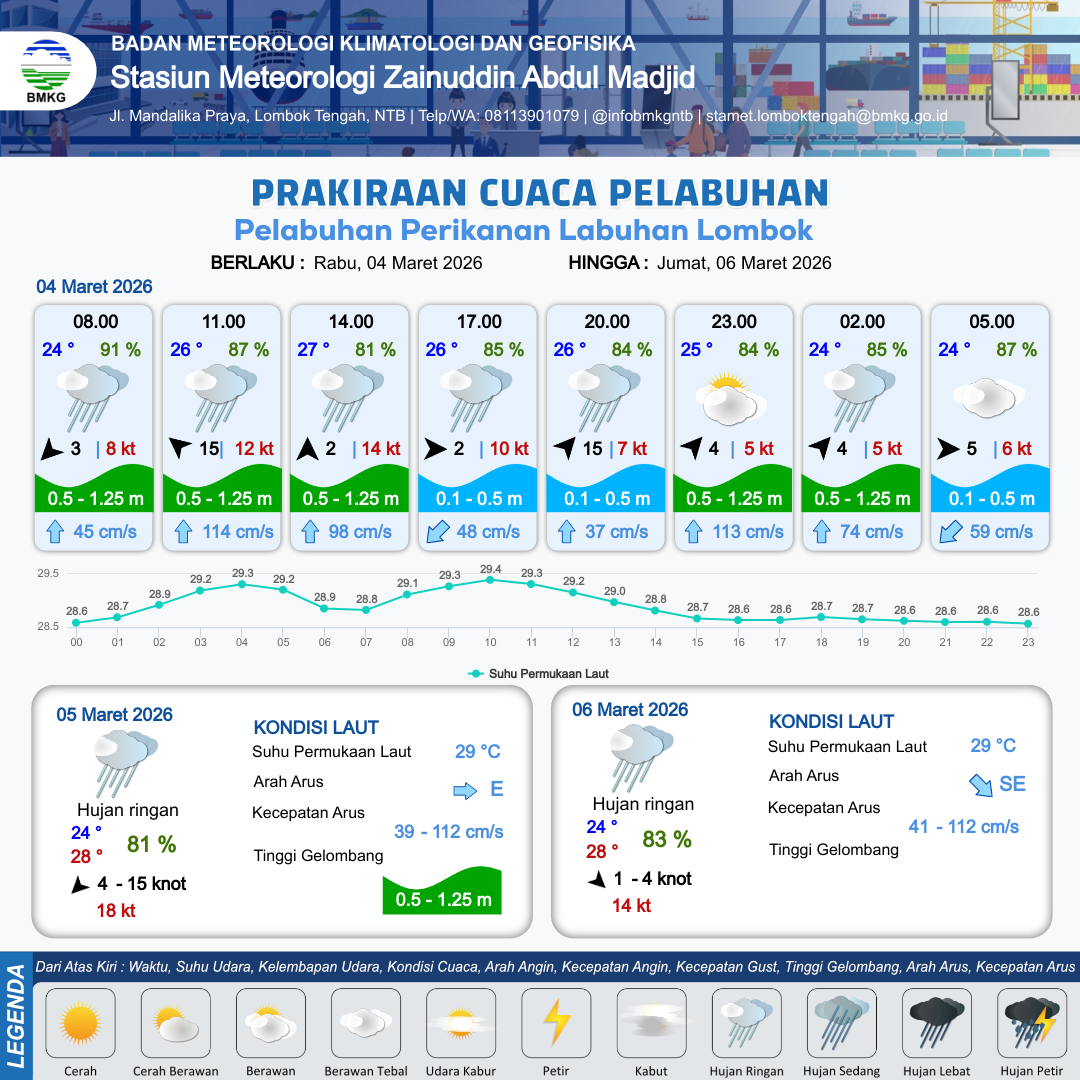 3 Mar 26, 08.00 12 jam yang lalu | Hujan Ringan | Barat Laut 8 kt Gust Peningkatan kecepatan angin yang singkat dan tiba-tiba : 14 kt | | | 5 km | 28 °C | 92 % | -0.28 m |