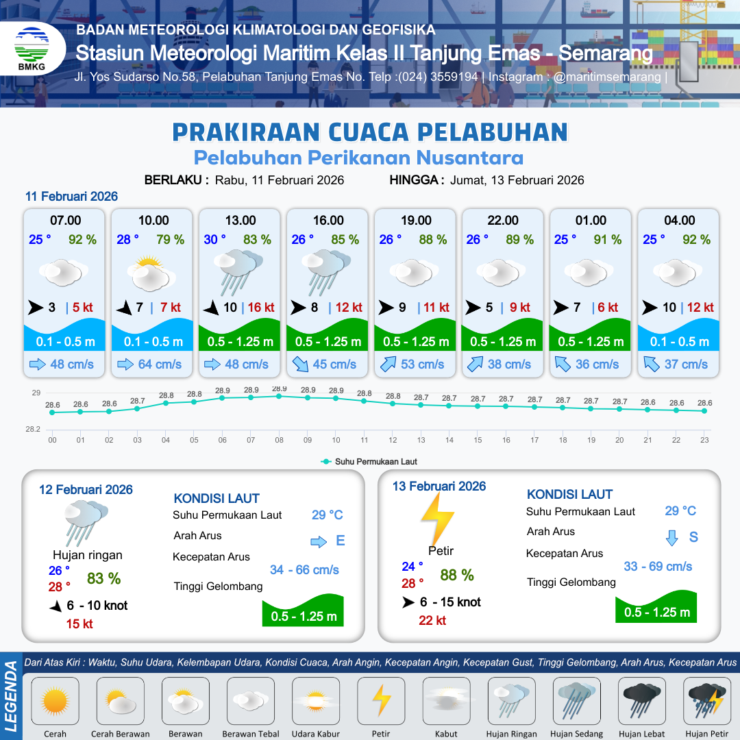 11 Feb 26, 19.00 3 jam kedepan | Barat 7 kt Gust Peningkatan kecepatan angin yang singkat dan tiba-tiba : 9 kt | 0.6 m Rendah | Barat Laut 38.0 cm/s | 9 km | 25 °C | 91 % | -0.01 m | |