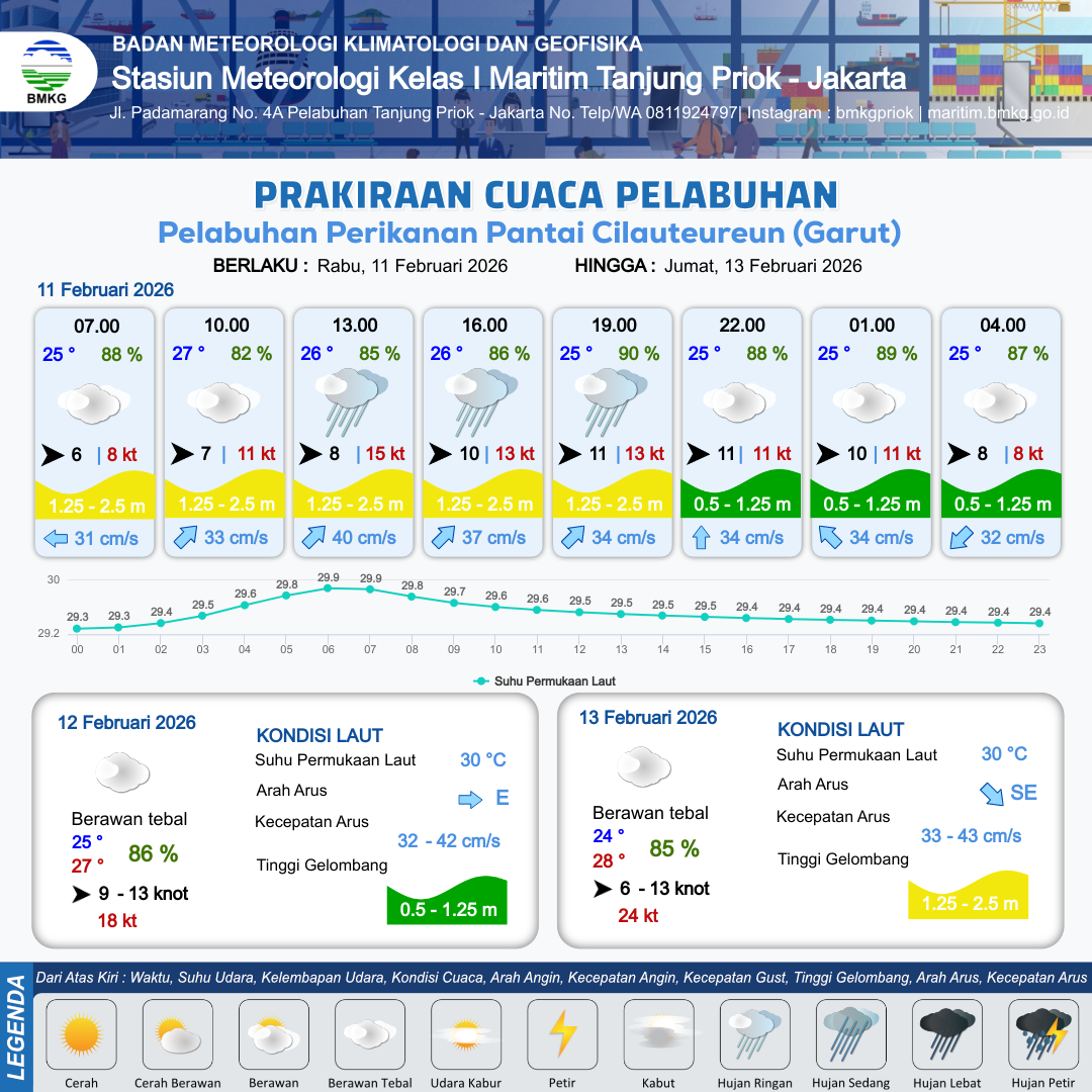 11 Feb 26, 18.00 2 jam kedepan | Barat 10 kt Gust Peningkatan kecepatan angin yang singkat dan tiba-tiba : 11 kt | 1.2 m Rendah | Barat Laut 34.0 cm/s | 10 km | 25 °C | 89 % | -0.14 m | |