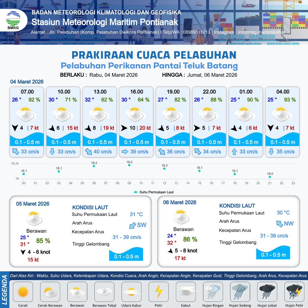 3 Mar 26, 10.00 10 jam yang lalu | Berawan | Barat 9 kt Gust Peningkatan kecepatan angin yang singkat dan tiba-tiba : 15 kt | | | 6 km | 31 °C | 72 % | -0.62 m |