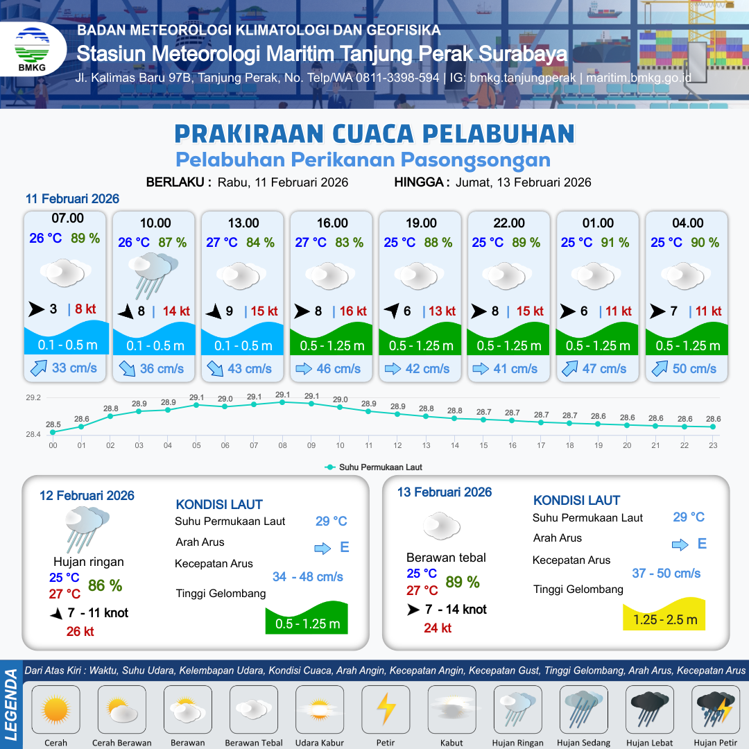 11 Feb 26, 23.00 7 jam kedepan | Barat 9 kt Gust Peningkatan kecepatan angin yang singkat dan tiba-tiba : 13 kt | 0.6 m Rendah | Timur Laut 42.0 cm/s | 10 km | 25 °C | 90 % | -0.57 m |