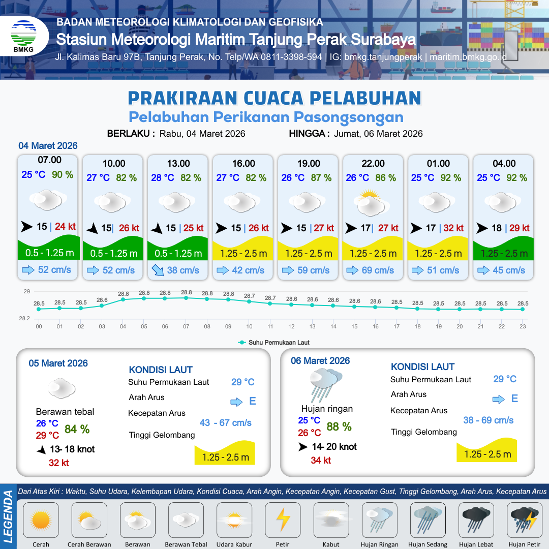3 Mar 26, 23.00 3 jam kedepan | Berawan Tebal | Barat 12 kt Gust Peningkatan kecepatan angin yang singkat dan tiba-tiba : 23 kt | | | 10 km | 25 °C | 89 % | -0.64 m |